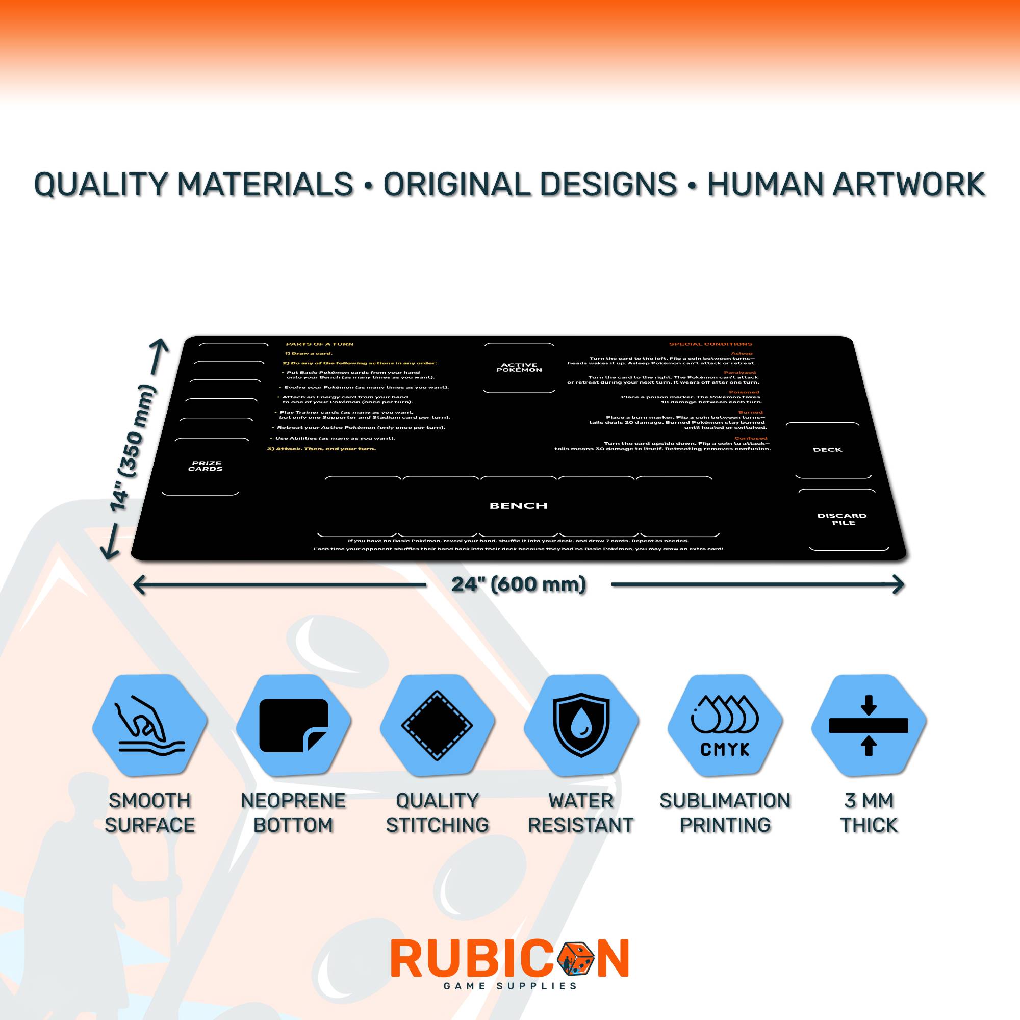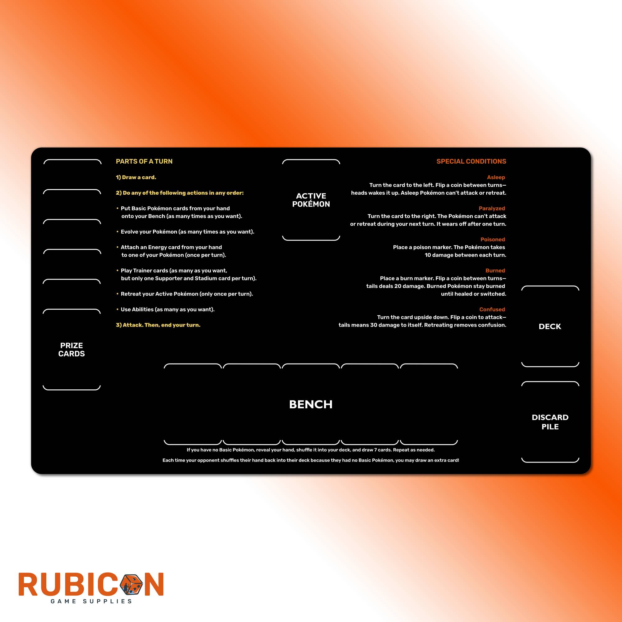 Pokemon TCG playmat for beginners, learn to play mat with turn guide, special conditions, neoprene, unofficial fan content