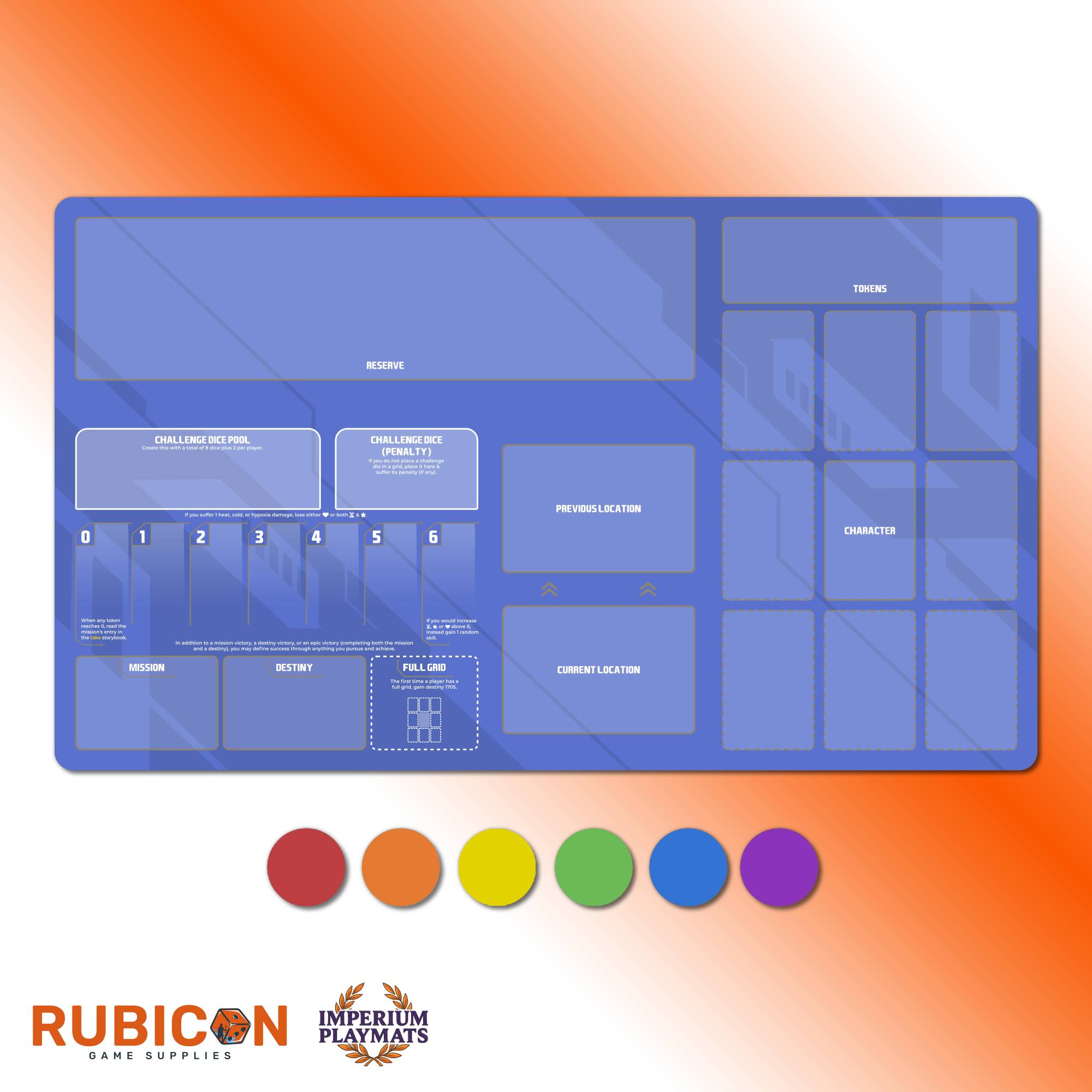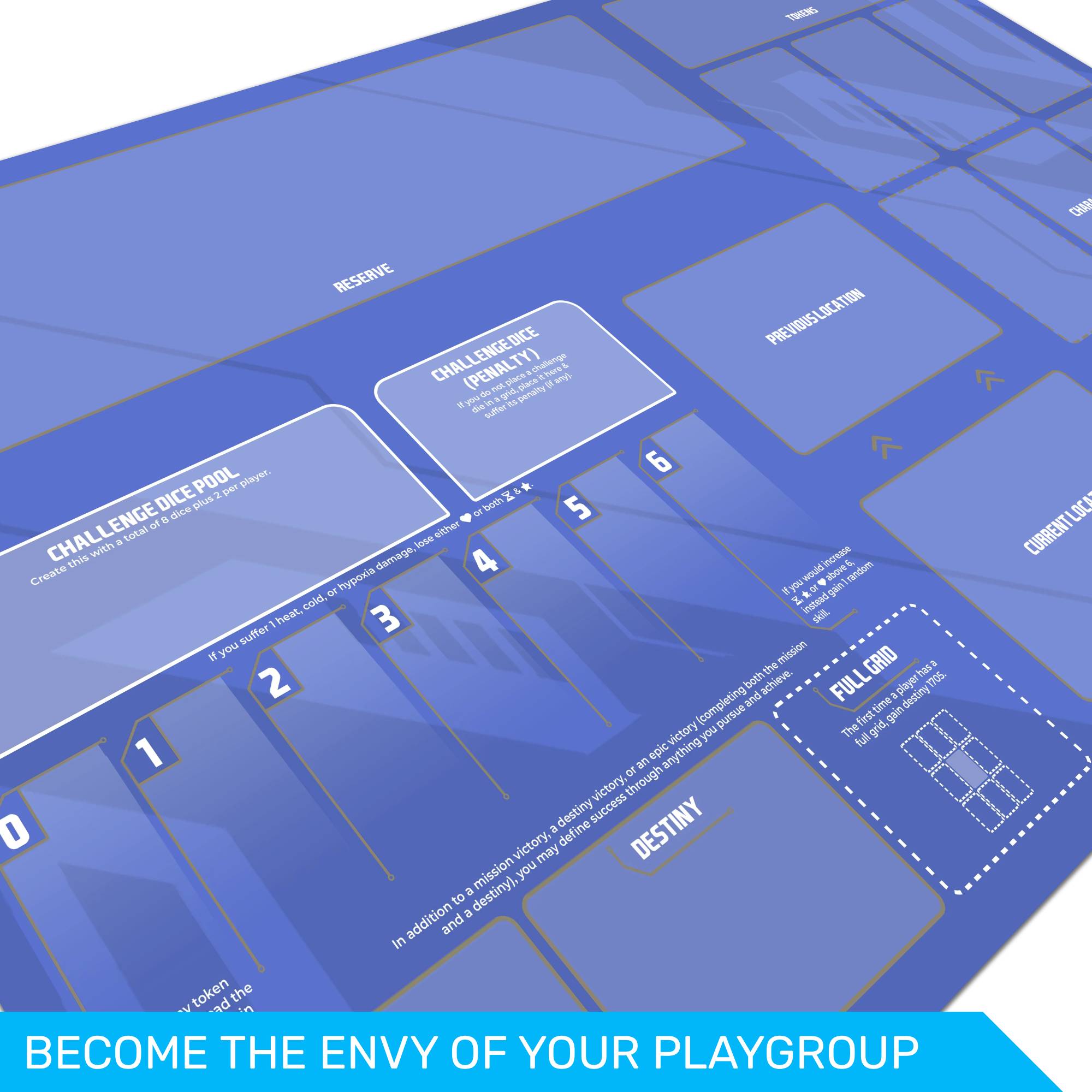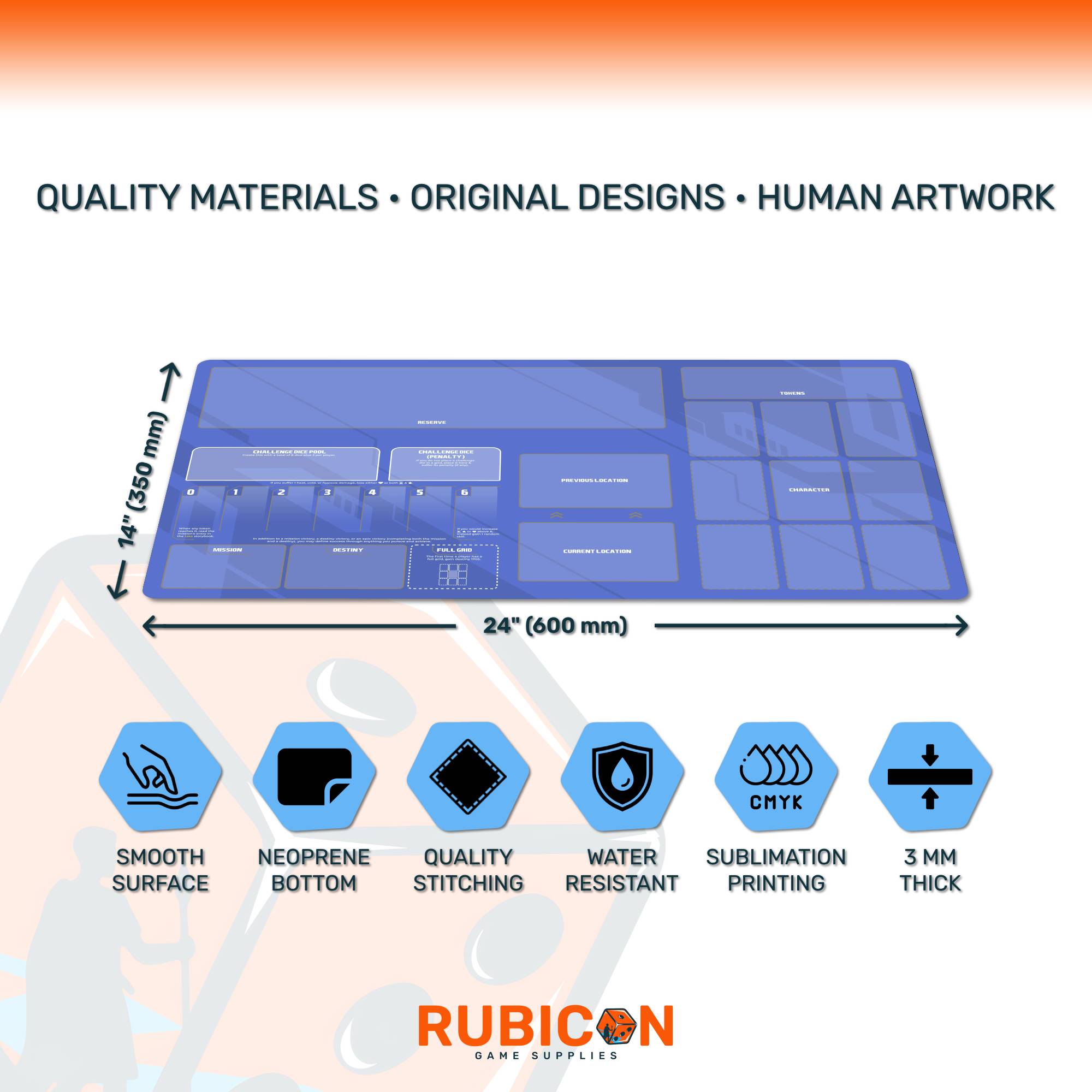 Vantage solo playmat, stitched neoprene mat for 3x3 grid, challenge dice, mission cards, compatible fan content, unofficial